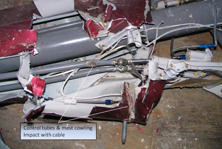 Collision with the ground wire was evident at the left bottom of the mast fairing area just below the pitot tube. No wire markings were evident on the right side of the mast fairing. The collective and cyclic control tubes running vertically alongside the rotor mast were bent and showed marks from impact with the wire (see Photo 1). The bending of the control tubes rendered the collective and cyclic controls partially inoperable, likely allowing the pilot limited control of the helicopter during the descent towards the river.