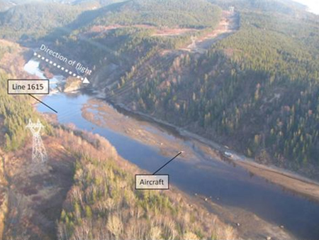The Transport Canada Aeronautical Information Manual (AIM), TP 14371E, a reference often studied and used by pilots, states that pilots should use caution when operating at low level because power lines, especially the ground wires hanging above the main conductor wires, are more difficult to see even in good visibility (see Figure 1) Footnote 11. Pilots are taught to look for the presence of towers or poles to detect the presence of wires or cables. They are also taught to fly over the towers, the highest points along the line. Unmarked wires are more difficult to detect.