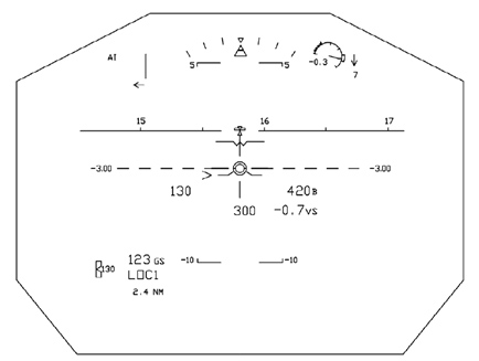 The HGS was selected to the A1 approach mode for the approach. The A1 mode is selected for manual (hand flown) ILS approach and landing operations to CAT 1 minimums. Footnote 13 In the A1 mode the combiner display is de-cluttered; the display does not provide beacon crossing indications. Images of the HGS Primary mode and the HGS A1 mode displays are presented in Appendix D. The combiner could display DME distances when available; however, DME distance was not available to the crew on this approach, as the Whitehorse VOR/DME was not tuned and the localizer did not provide DME distances.