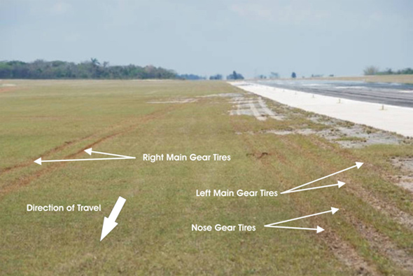 The aircraft then began tracking parallel to the runway with a 10° left crab for approximately 1745 feet. During that time, the engines began developing reverse thrust. At approximately 4300 feet from the threshold and at a speed of 40 knots, the aircraft re-entered the runway (see Photo 1).