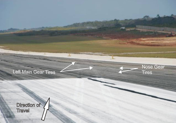 Photographs taken of the runway surface following the occurrence showed white 'steamed cleaned' tire tracks near the aircraft touchdown point (see Photo 3).