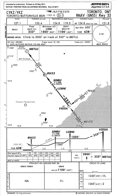 The aircraft was expected to remain in VFR conditions, climb 200 ft and maintain an altitude of 2500 feet asl while turning south to intercept the RNAV Runway 33 approach procedure. Upon reaching VIGSA the aircraft would turn northbound to a track of 333° magnetic. Once past this waypoint, the aircraft would have begun to descend to 1500 feet asl and, upon overflying waypoint LOBNI, would have contacted Buttonville tower. This is a standard published procedure for an RNAV (GNSS) Footnote 6 approach to Runway 33, which the aircraft was intending to perform.