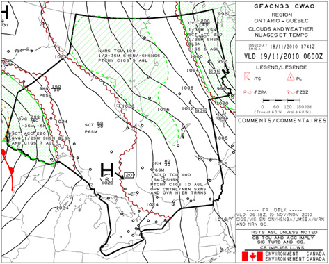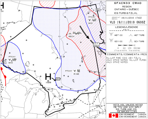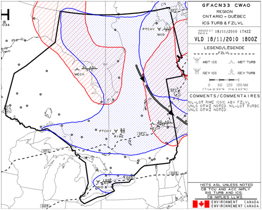 Environment Canada radar indicated precipitation in the form of rain moving in a southerly direction towards Lake Ontario from Lake Huron. The graphical area forecast (GFA) clouds and weather forecast for Ontario region valid at 1900 hours, forecasted isolated towering cumulus clouds, 2 statute miles visibility in light snow showers with a ceiling of 1000 feet agl over and off Lake Huron. The GFA icing turbulence and freezing forecast issued at 1242 and valid at 1900 showed no icing being forecast with a freezing level at 2500 feet asl. A second GFA issued at 1832 and valid at 1900 showed moderate mixed icing between 3000 to 9000 feet asl. This forecast was not available prior to the aircraft departing CYKZ. Although no PIREPS were received prior to the occurrence, aircraft in the vicinity and at an altitude of 2500 agl, were encountering light icing conditions with mixed precipitation, and a temperature of approximately − 2°C.