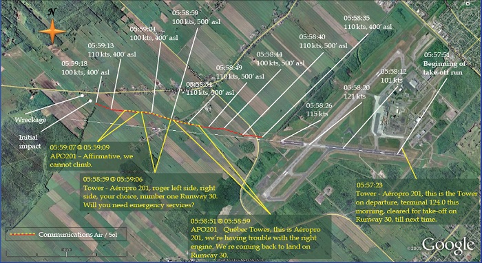 On 23 June 2010, the Beechcraft A100 King Air (registration C-FGIN, serial number B-164) operated by Aéropro (2550-4330 Québec Inc.) as flight APO201 was making an instrument flight rules flight from Québec to Sept-Îles, Quebec. At 0557 Eastern Daylight Time, the crew started its take-off run on Runway 30 at the Québec/Jean Lesage International Airport; 68 seconds later, the co-pilot informed the airport controller that there was a problem with the right engine and that they would be returning to land on Runway 30. Shortly thereafter, the co-pilot requested aircraft rescue and fire-fighting (ARFF) services and informed the tower that the aircraft could no longer climb. A few seconds later, the aircraft struck the ground 1.5 nautical miles from the end of Runway 30. The aircraft continued its travel for 115 feet before striking a berm. The aircraft broke up and caught fire, coming to rest on its back 58 feet further on. The 2 crew members and 5 passengers died in the accident. No signal was received from the emergency locator transmitter (ELT).