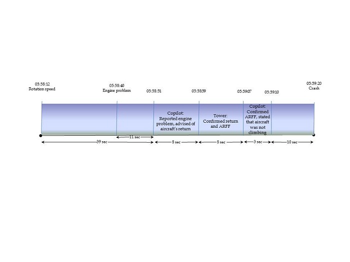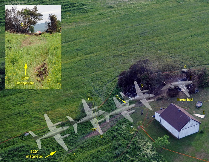 The crash occurred shortly after take-off, when the fuel tanks contained approximately 388 gallons of fuel. The location of the crew members and the fact that all of the passenger seatbelts were unbuckled show that all occupants survived the impact. This also suggests that the crew tried to start evacuating the aircraft. The aircraft's upside-down position and the damage it sustained prevented the occupants from evacuating, causing them to succumb to the smoke and the rapid, intense fire.