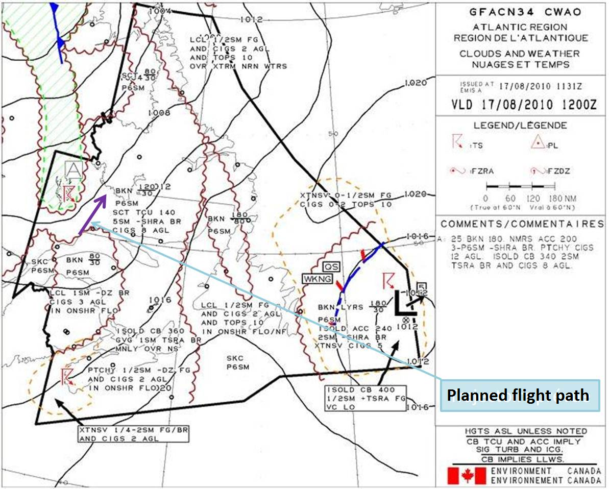The flight area, north of Sept-Îles, was cloudy due to an approaching cold front moving eastwards. The graphical area forecast (GFA), valid at 0800, showed a cloudy area with, among other things, a layer of broken cloud at 3000 feet agl and visibility of 6 sm (Appendix B). Isolated cumulonimbus clouds with tops of up to 14 000 feet created a risk of light rain and fog, which could reduce visibility to 5 sm and result in ceilings at 800 feet agl. However, a radar image of the flight area did not show echoes that might indicate the presence of cumulonimbus clouds. No AIRMETFootnote 12 or SIGMETFootnote 13 was issued for the flight area on the day of the accident.
