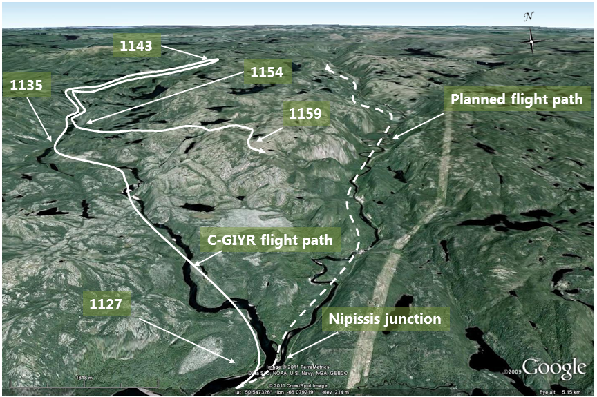 - For unknown reasons, the pilot did not take the fork in the Nipissis River but eventually had to turn back because of the clouds covering the terrain. This extension of the flight reduced the amount of fuel available to reach the destination.
