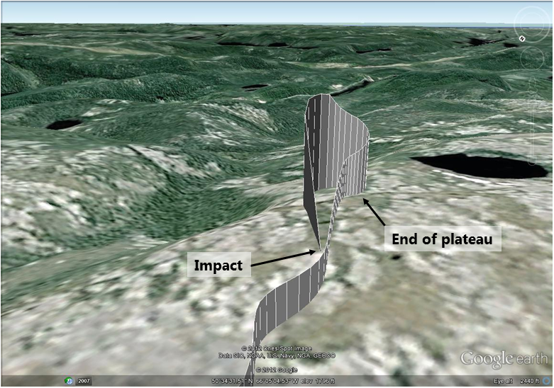 When C-GIYR reached the southeast end of the plateau where the terrain rapidly descends towards the valley, the aircraft began climbing and its speed decreased. The helicopter climbed about 200 feet, made a half-turn and initiated a descent at an average rate of 4500 feet per minute, striking the surface of the plateau at a steep angle of descent.