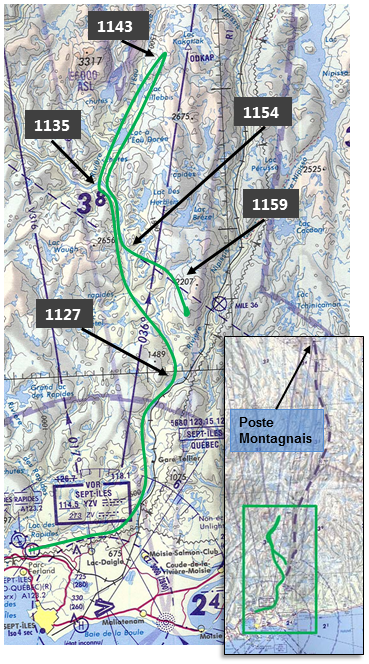 Eight minutes later, the pilot turned right, leaving the Moisie River and taking a valley towards Poste Montagnais (Figure 5, 1135). However, he made a half-turn at the end of that valley (Figure 5, 1143), going back to the Moisie River. The reduction in speed before the half-turn indicates that visibility was reduced at the end of the valley and that the mountain pass, which was over 2000 feet asl, was in the clouds.
