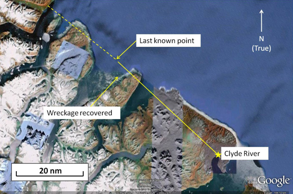 At 0200 (17 August), the JRCC Trenton took over as SAR Mission Coordinator as the LKP was in its region of responsibility. Multiple other assets were tasked on 17 August. Weather delayed further search operations until later in the morning of 17 August. At 1740, some wreckage was found floating near the south shore of the fjord close to the LKP (see Photo 1). The fjord is approximately 15 nm wide at the mouth; the LKP was approximately 5 nm from the south shore of the fjord. Crews continued searching throughout the remainder of 17 August and all of 18 August without finding any further wreckage or the pilot. The wreckage was subsequently recovered by a Canadian Coast Guard ship and later transported to Clyde River.