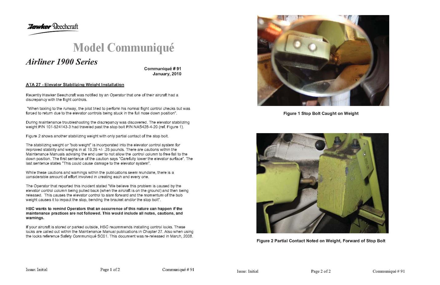 In May 2012, Hawker Beechcraft Corporation issued Model Communiqué #104 to announce newly developed Airliner Maintenance Manual inspection procedures intended to identify and correct noted damage to the stop bolt, the stop-bolt bracket, the bob-weight, and other supporting structures. These procedures require an alignment check of the bob-weight with the stop bolt to ensure that no part of the stop bolt protruded beyond the face of the bob-weight, and a visual examination of the weight for evidence of scraping along the side and for evidence of damage to the stop bolt and stop-bolt bracket.