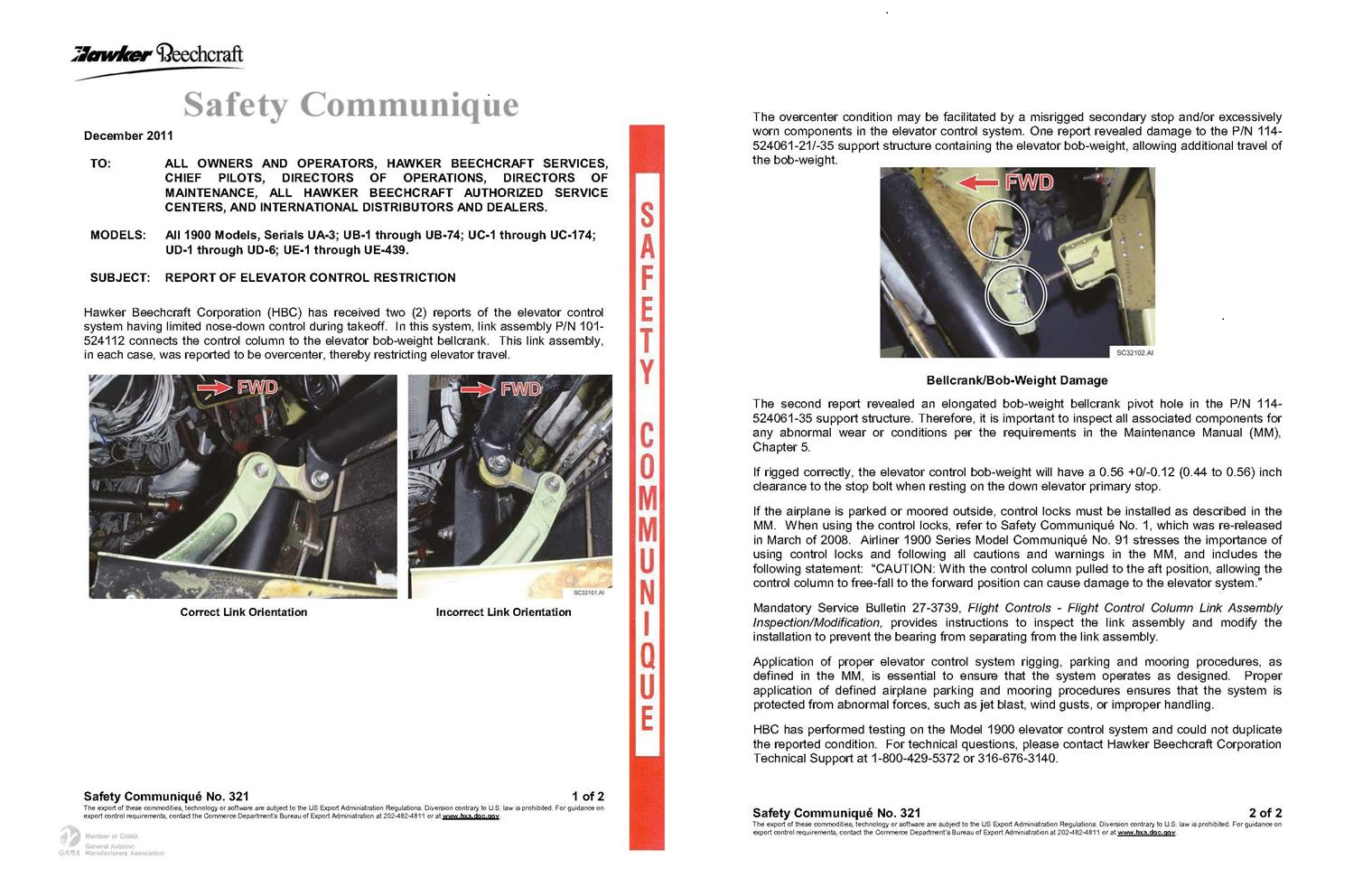 In June 2013, Hawker Beechcraft Corporation issued Mandatory Service Bulletin SB 27-4119. This Service Bulletin introduces Kit 114-5060 (KIT − BOB WEIGHT STOP, ELEVATOR SYSTEM) for Model 1900-series airplanes, and provides parts and instructions to install a second elevator bob-weight stop bolt.