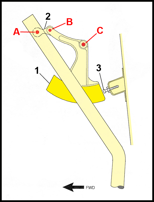 The design of the bob-weight system is such that the further rearward the bob-weight travels, the more aligned the link assembly attachment points (items A and B) become with the bellcrank pivot point (item C). Under normal operating conditions, these 3 points are not aligned, thereby providing an over-centre protection. If completely aligned, then it is possible that the link could go over centre. When the link goes over centre, the geometry of the link assembly attachment points is changed, and elevator travel becomes limited;Footnote 8 full nose-down movement cannot be achieved. FDR data from the occurrence aircraft show that, after the crew freed the elevator controls, the control-column forward movement was restricted to a position corresponding to about 6.7° nose-up.