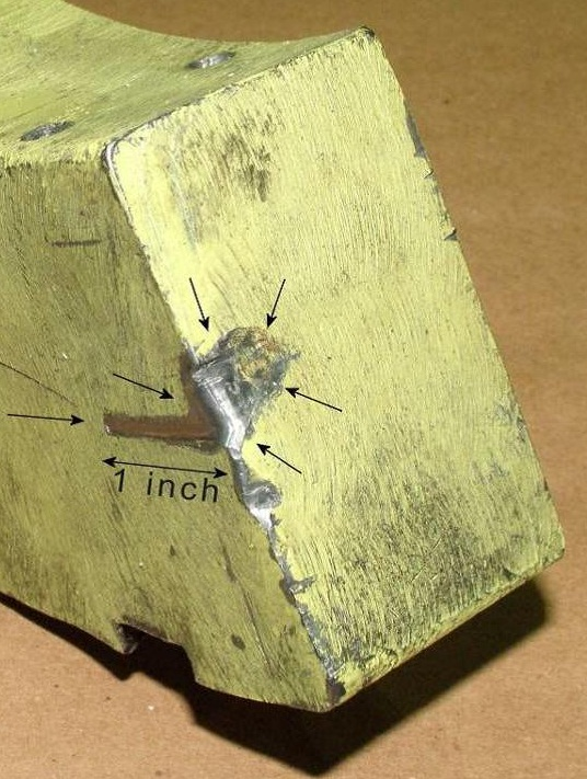 Examination of the bob-weight showed that there were multiple imprints caused by the stop bolt, and these imprints exhibited progressive movement toward the left edge. When the stop bolt contacted the bob-weight at the edge, it was forced over and slid down the side of the bob-weight for approximately 1 inch (Photo 3).