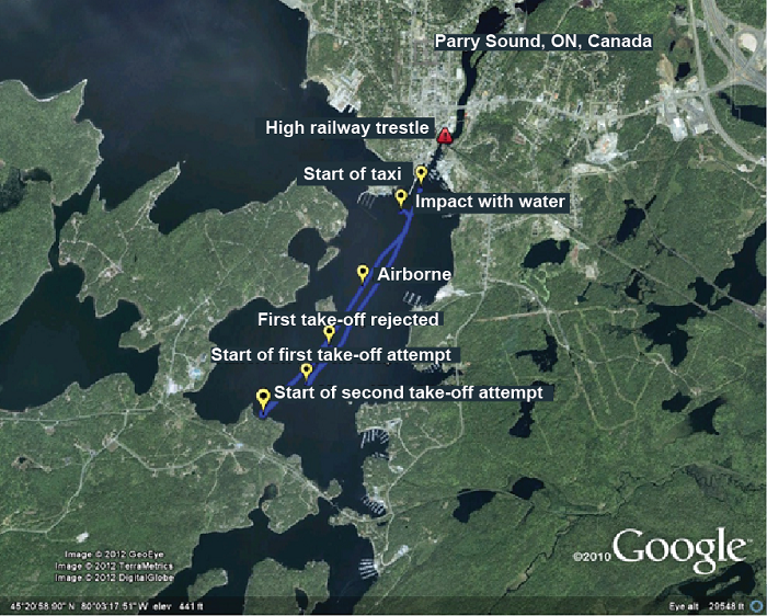The pilot elected to take off into the wind and, as such, taxied toward the southwest end of the harbour. The engine run-up and pre-take-off checklist were completed while taxiing; no anomalies were noted. Flaps were set correctly at 20° for take-off. Approximately 1400 feet from the shore, the pilot turned the aircraft northeast and began the take-off run. The aircraft had difficulty getting on the step, Footnote 2 and the pilot rejected the take-off attempt after approximately 1300 feet of take-off run.