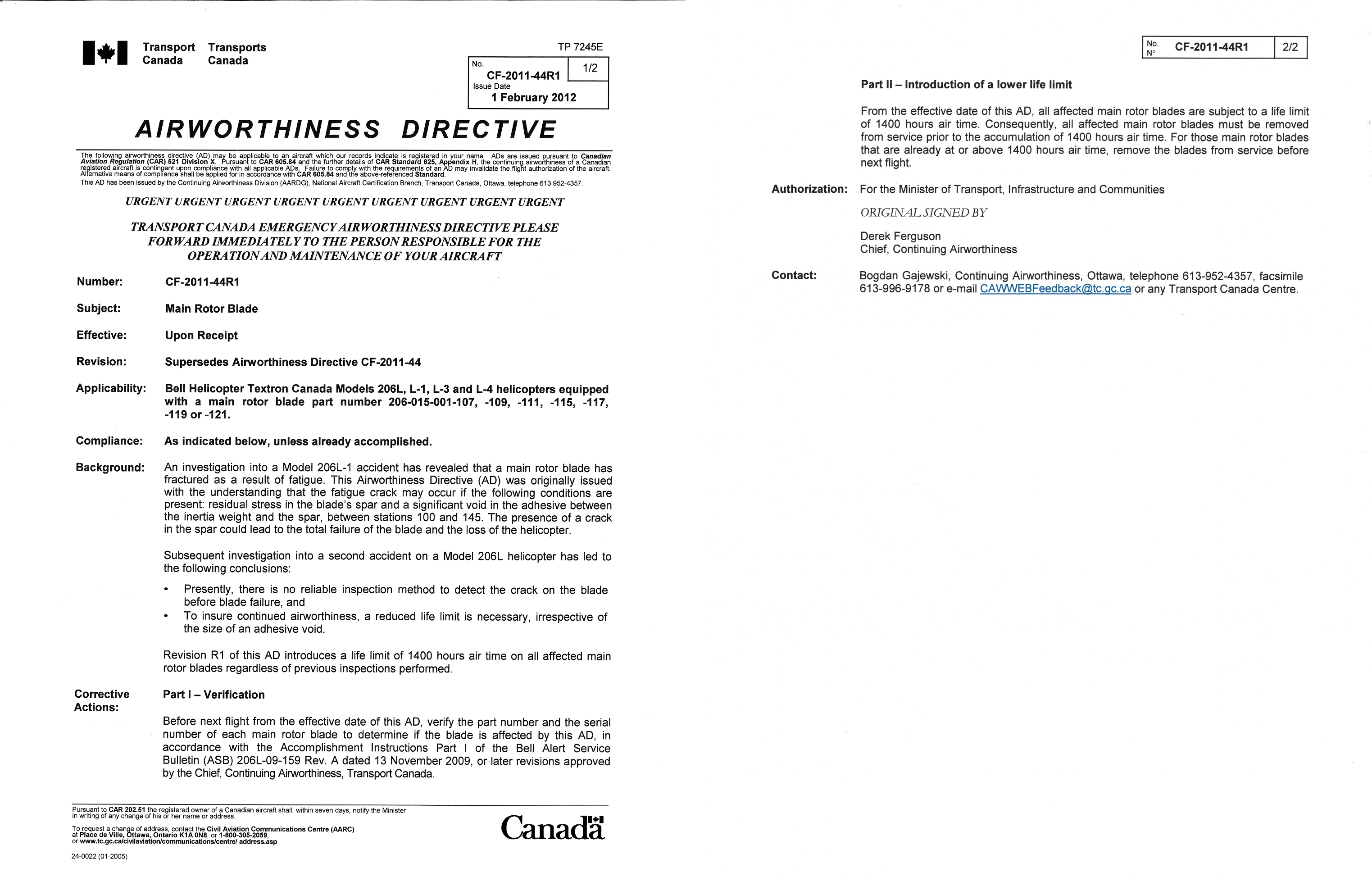 On 01 February 2012, TC revised AD CF-2011-44. The revised AD stated that there is no reliable inspection method to detect cracks on the blade before blade failure, and that in order to ensure continued airworthiness, a reduced life limit is necessary, irrespective of the size of the void in the adhesive. The revision introduced a life limit of 1400 hours air time on all affected main rotor blades, regardless of previous inspections performed. Consequently, all affected main rotor blades were mandated to be removed from service prior to the accumulation of 1400 hours air time. For main rotor blades at or above 1400 hours air time, the blades were to be removed from service prior to the next flight.