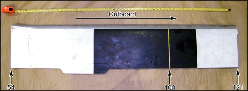 The top surface of the inboard section of the occurrence blade was marked chord-wise with a yellow painted line at blade station 100 (Photo 1). The outboard section of the occurrence blade was not recovered, therefore it could not be determined if it was marked at blade station 145. The mating blade was marked at the appropriate blade stations, as per the ASB.