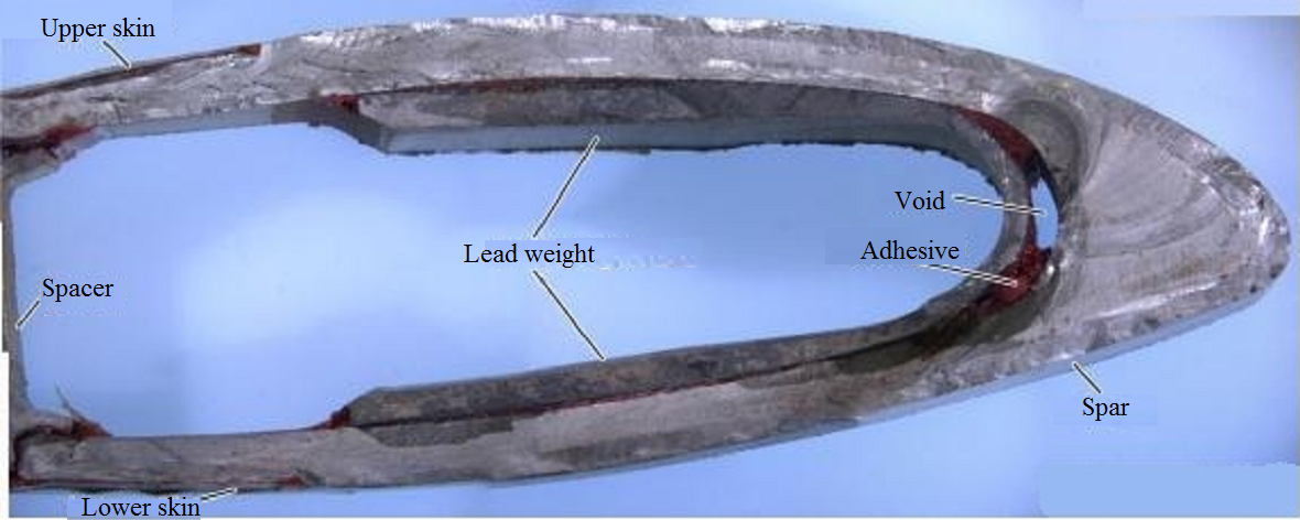 The surface of the spar at the fatigue origin exhibited no evidence of corrosion or previous mechanical damage; however the overall fracture pattern was very similar to the pattern in this occurrence. The origin of the fatigue crack coincided with a large void in the adhesive between the inside surface of the spar and the lead weight.
