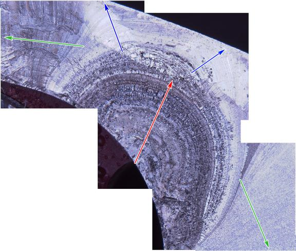 Eventually, the crack propagation direction changed so that one portion of the crack started to advance towards the leading edge, and the other portion, to the trailing edge of the blade (see green arrows in Photo 4). The general direction of the crack propagation at this stage was consistent with cyclic, predominantly in-plane bending of the blade (high-frequency loading. The crack growth became unstable and it accelerated, eventually leading to blade separation. It was impossible to accurately determine the number of cycles required for the initial fatigue area (red arrow) to grow to its observed size because striations in this region had been obliterated by rubbing and corrosion damage.