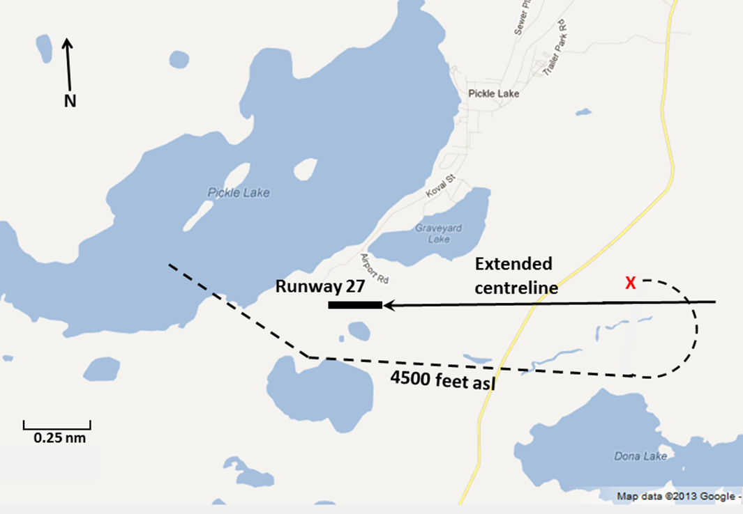 The normal circuit altitude at Pickle Lake is 2300 feet asl. The relative positions of the 2 aircraft resulted in the second aircraft reaching final approach for Runway 27 ahead of C-GZLC. A series of 3 microphone clicks was heard on the MF, and shortly afterward the second aircraft landed on Runway 27 (1927:52). As it turned off the runway lighting, the crew of the second aircraft observed C-GZLC approximately 1-mile on what appeared to be a final approach in steep descent towards Runway 27. Visual contact with C-GZLC was lost as the second aircraft turned on to the taxiway. The last transmission from C-GZLC was at 1928:20 when the pilot called final for Runway 27.