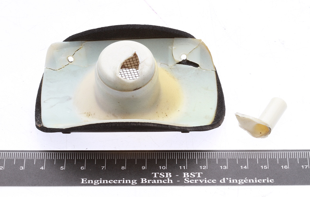 The stall warning system includes a stall warning horn and a scoop assembly. The stall warning horn is found on the inside of the cabin, behind the doorpost moulding and to the outboard side of the pilot on the fuselage rib. The scoop assembly is installed on the leading edge of the left wing at wing station (WS) 91.25. The scoop is operated by airflow over the surface of the wing. An internal reed in the stall warning horn sounds when the airspeed is approximately 8 to 15 knots greater than the airplane stall speed.Footnote 3 The scoop is attached to the wing leading edge by 4 fasteners. Cracks were found in the scoop flange at all fastener locations. The pipe at the back of the scoop was fractured from the scoop at its base (Photo 1).