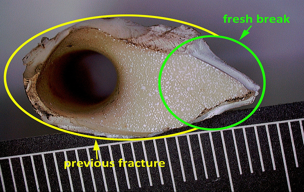 The scoop was made of acrylonitrile-butadiene-styrene (ABS) plastic. It failed in a brittle, progressive mode, consistent with environmental stress cracking,Footnote 4 weatheringFootnote 5 and thermal degradation. This degradation would have further contributed to the embrittlement of the scoop material. The crack initiation date and rate of progression could not be determined.