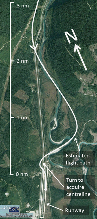 Once the aircraft entered poor weather near the runway, the alternatives became more difficult to conduct. As the aircraft approached Blue River, the valley narrowed, and at the aircraft's altitude, the valley was only 1 nm in width in certain places. At the speed the aircraft was flying, turning the aircraft around using 30° of bankFootnote 3 would require about 1.6 nm of horizontal distance. A successful course reversal would require a significant reduction in airspeed, an increase in altitude, a higher angle of bank, or a combination of all 3. A climb procedure would involve climbing in cloud, over an area not assessed for obstacle clearance, with mountains extending 5000 feet above the altitude of the aircraft.