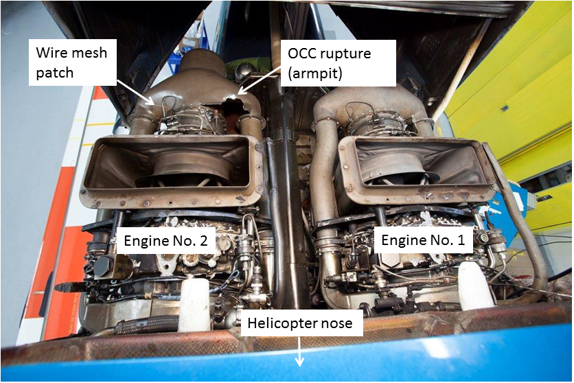 A preliminary examination of the engine during retrieval from the water revealed that the No. 2 engine (starboard) had experienced a catastrophic failure of the outer combustion case (OCC). Photo 1 shows the damage to the No. 2 OCC.