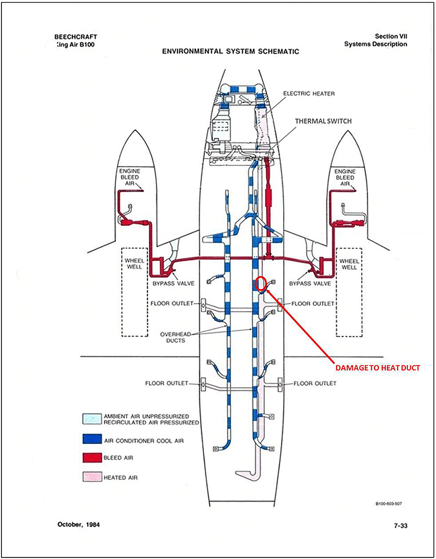 On 10 February 2012, 11 days before this occurrence, a discrepancy was noted in the occurrence aircraft log book, which indicated that the right-hand bleed air warning lightFootnote 3 had illuminated during take-off. After an investigation by the company's maintenance department, a bleed air line was found disconnected in the aft cabin on the right side. A disconnection leads to a drop in pressure inside the tube, which triggers the warning light. On 17 February 2012, a discrepancy was again noted in the log book, which indicated that the right-hand bleed failed when using de-icer boots. A bleed air line was found damaged; it was replaced, and the aircraft was returned to service. There was no entry in the log book indicating that other components adjacent to the bleed air line (such as hot air ducts) had been checked.