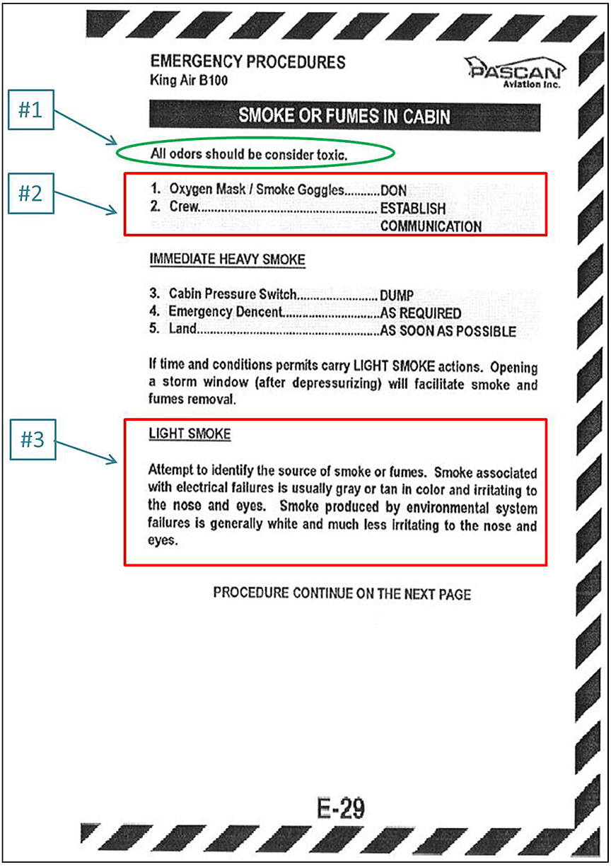 The SMOKE OR FUMES IN CABIN emergency procedure checklist (Appendix C) begins with a note advising that “all odors should be consider [sic] toxic” followed by the memory items: