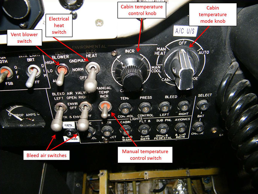 An environmental control panel on the SIC's side of the cockpit is provided for automatic or manual control (Photo 2). It contains a vent blower switch (VENT BLOWER), an electrical heat switch (ELEC HEAT), a cabin temperature control knob (CABIN TEMP), a cabin temperature mode knob (CABIN TEMP MODE), 2 bleed air valve switches (BLEED AIR VALVE) and a manual temperature switch (MANUAL TEMP).