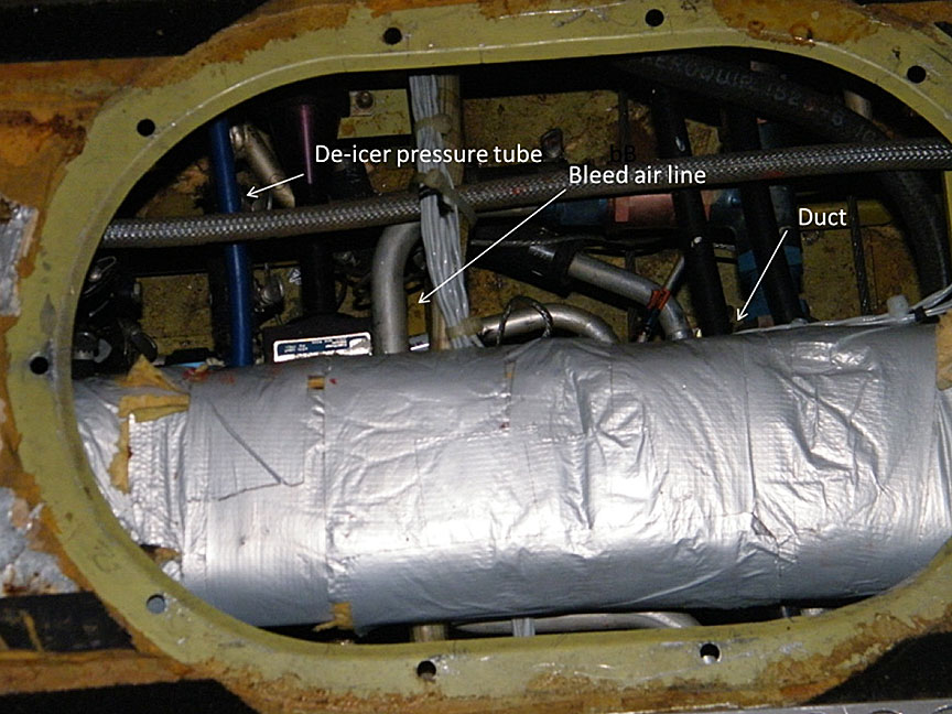 The bleed air lines are not insulated and are located within 0.5 inches of the hot air duct, a few inches from the de-icer tube.
