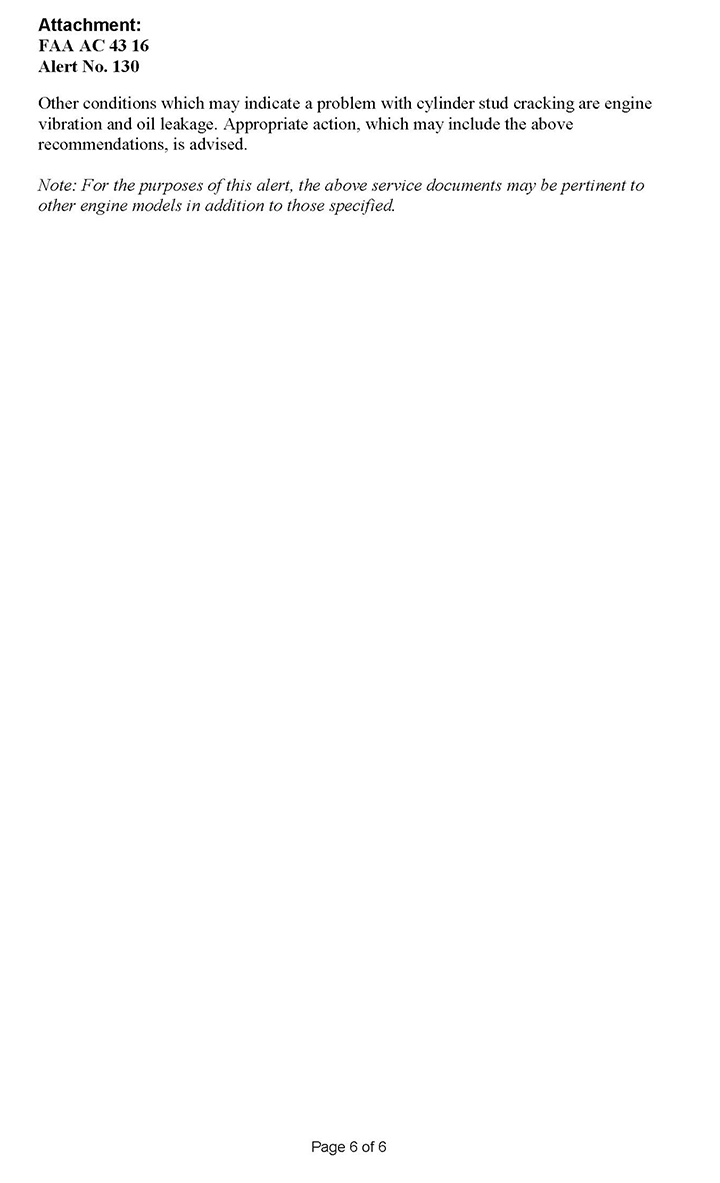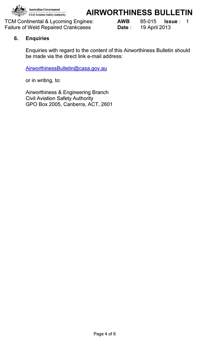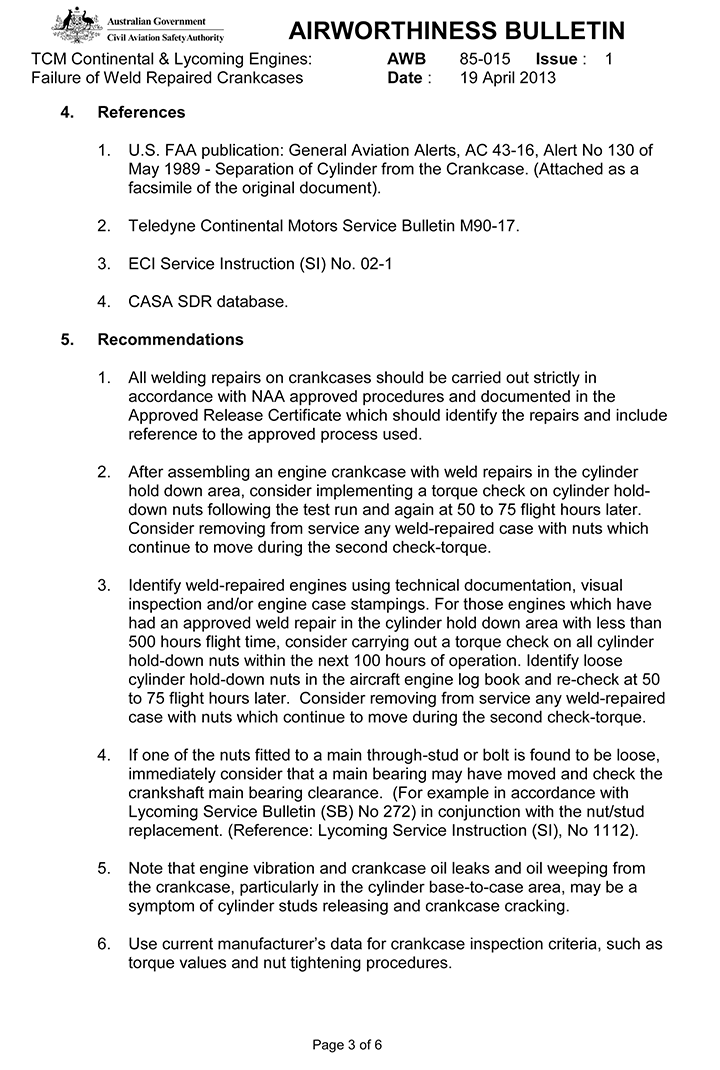 On 19 April 2013, the CASA issued Airworthiness Bulletin (AWB) 85-015 (Appendix A)Footnote 19 after receiving reports of failures and cracks near cylinder studs and through-boltsof weld-repaired crankcases. The bulletin makes 6 recommendations regarding repair methods, documentation of repairs, post-repair maintenance checks, and symptoms of a problem.