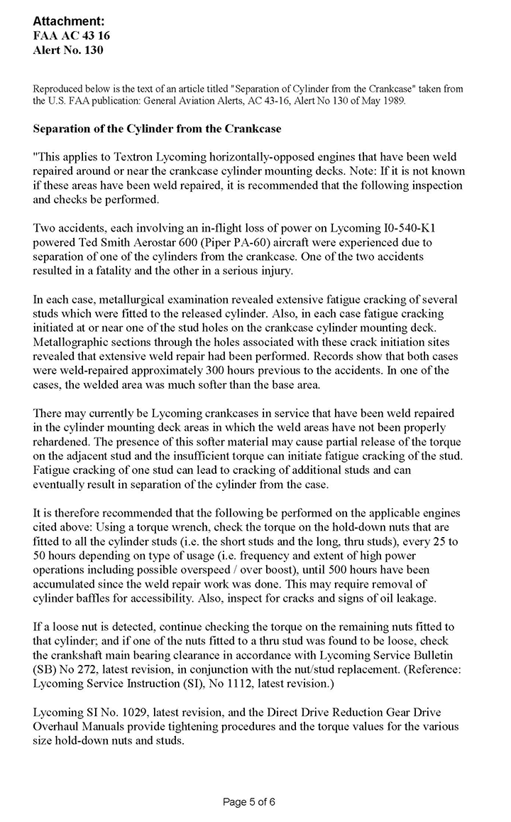 As well, in May 1989, the FAA published an alertFootnote 18 that documents problems associated with weld-repaired crankcases. The document relates 2 events in which the separation of a cylinder from the crankcase caused the engine to stall after fatigue cracks appeared at or near the stud holes. The alert recommends checking cylinder studs and bolts.