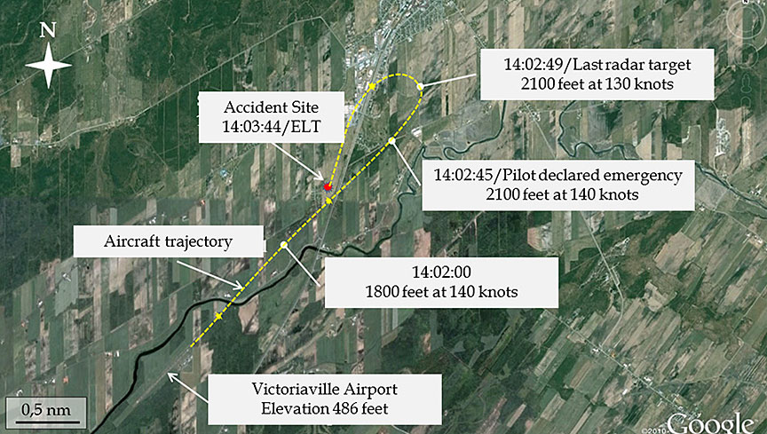 The Piper PA-34-200 (registration C-GNAS,serial number 34-7350133) departed from the Trois-Rivières Airport, Quebec,with 2 pilots on board for an instrument training flight. The pilot in training (the pilot), who was occupying the left seat, was at the controls. The pilot was conducting an RNAV (GNSS)Footnote 1 RWY 06 approach to the Victoriaville Airport, Quebec; he pulled up after a missed approach in order to enter a holding pattern at the LESOS waypoint. At 1401:44,Footnote 2 while at 1600 feet and climbing to 4000 feet, the instructor called the air traffic control centre (ACC). About 1 minute later, at approximately 2100 feet, the right engine experienced a catastrophic failure, and flames engulfed the engine nacelle. Thick smoke quickly filled the cockpit. The instructor immediately took control and carried out the engine fire checklist procedure from memory. At 1402:45, the pilot declared an emergency and indicated that he wanted to land. The ACC alerted the Joint Rescue Coordination Centre (JRCC) and called the 911 dispatcher, who alerted the Victoriaville Fire Department and the Sûreté du Quebec. The ACC then tried unsuccessfully to communicate with the aircraft.