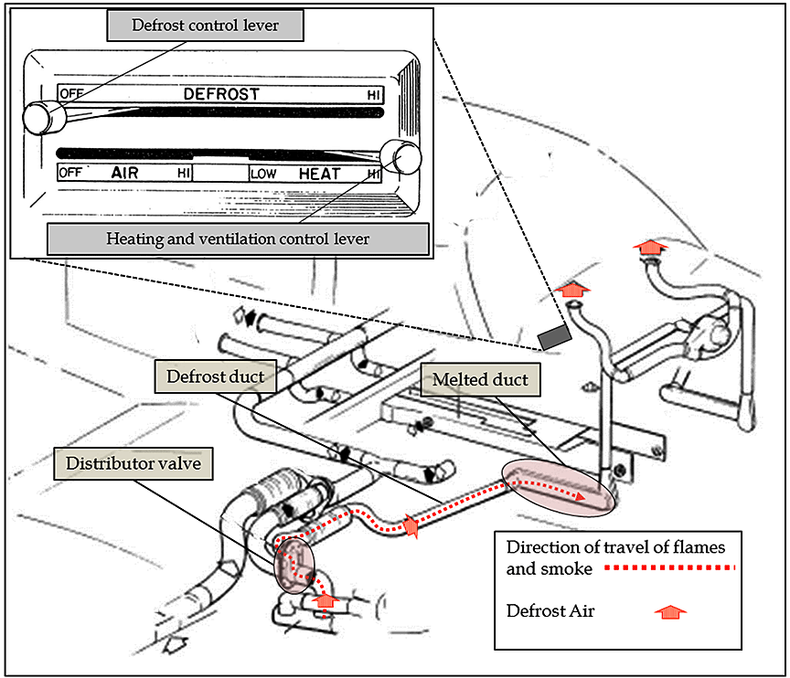 - The flap on the right distributor valve was open, and the cable connecting the defrost lever was disconnected. It was therefore impossible to prevent the ram air in the engine compartment from flowing through the defrost system and into the cockpit.