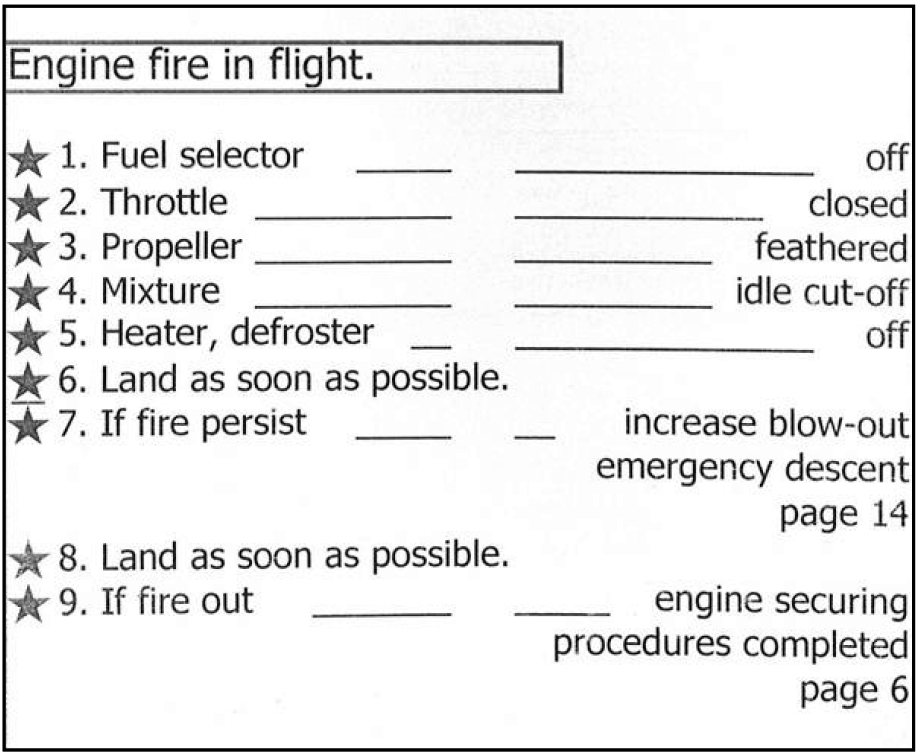 This procedure, which pilots must memorize, requires the pilot to immediately take certain actions. The first steps of the procedure are the following: turn off the fuel selector, close the throttle, feather the propeller, pull the mixture control to the idle/cut-off position, and close the heat/defrost air inlets. The purpose of these actions is to cut the flow of pressurized oil and fuel to the engine compartment to shut down and secure the affected engine. It also prevents fire and smoke from spreading into the cabin through the heater and defroster air ducts.