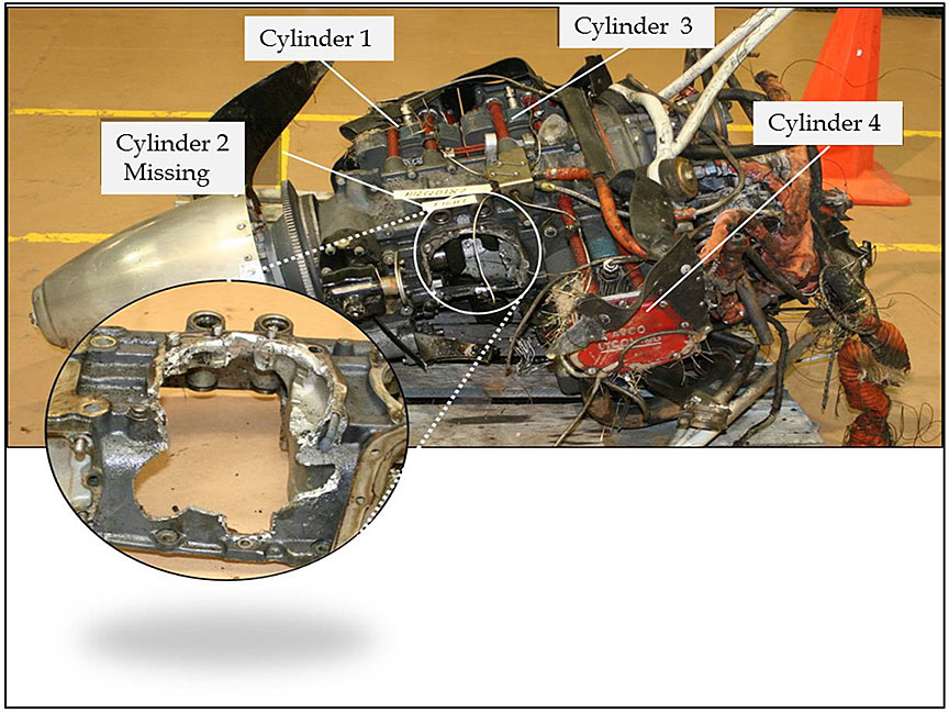 - The catastrophic failure of the No. 2 cylinder released pressurized engine oil, which sprayed into the engine compartment and then caught fire on contact with the exhaust system.