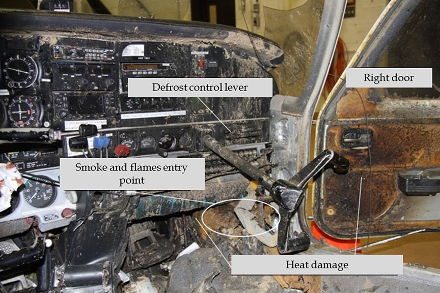The soot accumulation found in the ventilation system indicates that the smoke and flames entered the cabin through the ducts and conduits of the defrost system on the right side. The smoke spread through the cabin through the vents at first, then through the hole created by the flames in the right side of the cabin, at the instructor's feet.