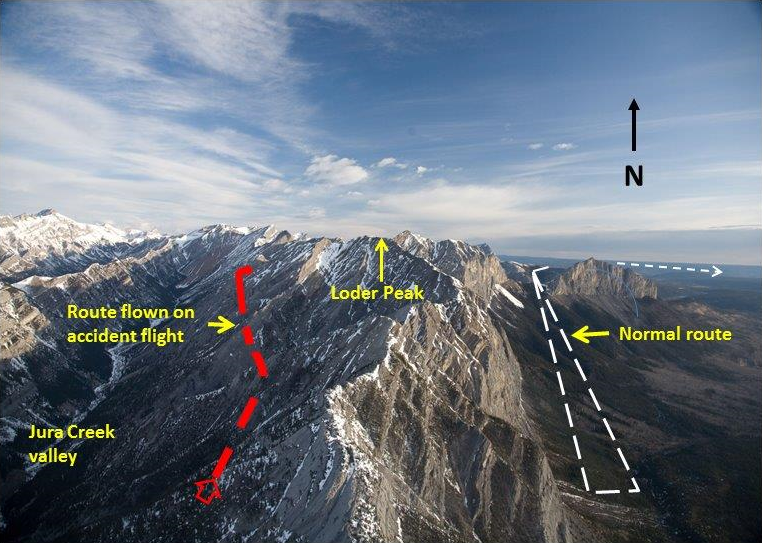 The Rockies Heritage Tour flight route was a 25- to 27-nautical−mile (nm) circular route. This flight normally proceeded south from the CNK7 base to Barrier Lake, then west to Heart Mountain, and north to the Trans-Canada Highway. After crossing the Trans-Canada Highway, the flight would continue northbound, and would normally track east of Loder Peak (Photo 1). A flight tracking west of Loder Peak would enter the Jura Creek Valley, and then cross a ridge to the north of Loder Peak from west to east, before descending to Brokenleg Lake. The ridges to the north of Loder Peak crested at 7300 to 7400 feet above sea level (asl). The route to the east of Loder Peak paralleled the slopes east and north of Loder Peak, with the Alberta plains immediately to the east. The eastern route could be completed at significantly lower altitudes. Once reaching Brokenleg Lake, with or without a stop, the flight would track directly back to the CNK7 base. The route could be changed at the pilot's discretion due to wind, weather, or time constraints. The accident flight was expected to take 0.3 hours of air time and about 1.3 hours overall, as the passengers had opted for the stop at Brokenleg Lake.