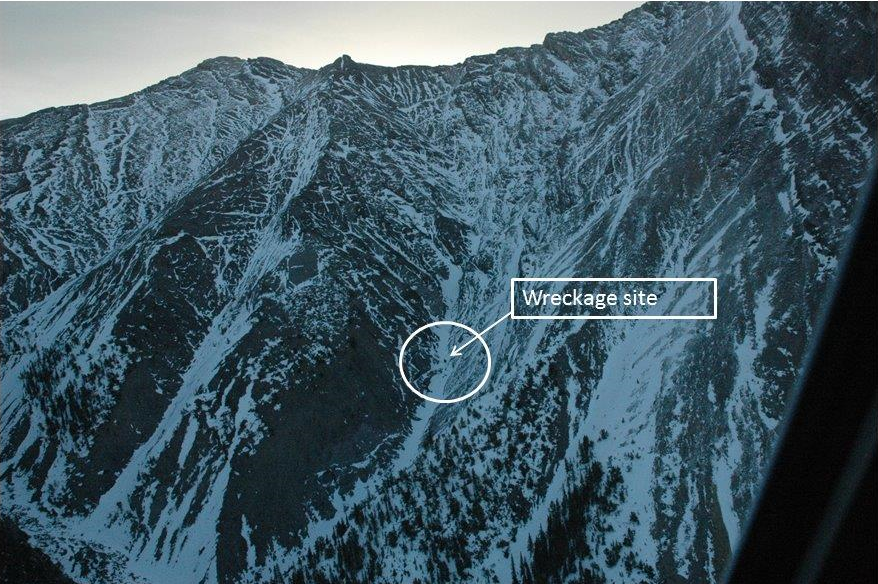 The wreckage came to rest at 6700 feet asl, at 51°06′38.63″ N, 115°09′07.64″ W. The tail boom and main rotor separated during the impact sequence. The fuselage came to rest in snow on its left side, in a nose-low attitude and partially inverted. Investigators were unable to travel to the accident site, due to the risk of rock slides and snowslides; therefore, ground scars associated with the accident were not identified.