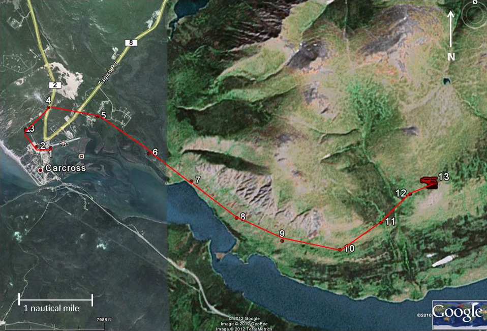 The flight departed at 0853 Footnote 1 and reached the first site at 0917, and visited another 9 sites in the region west of Carcross before stopping for fuel at 1148. At 1210, the helicopter departed the refuelling site, and proceeded to 9 more bait sites northwest and southwest of Carcross. Throughout the day, high winds prevented them from inspecting some sites at higher elevations. At 1442, the aircraft, registration C- GHZN, landed at Carcross and refuelled. Due to high winds, the pilot indicated that they would inspect as many of the outstanding sites as they could on the flight back to Whitehorse. The helicopter departed Carcross at 1501 for the final leg of the day, proceeding to a site east of Carcross. The flight followed the north shore of Tagish Lake and approached the wildlife survey site from the west. The pilot had been at this site numerous times in the past. The last GPS targetFootnote 2 was recorded at 1507 (Figure 1).