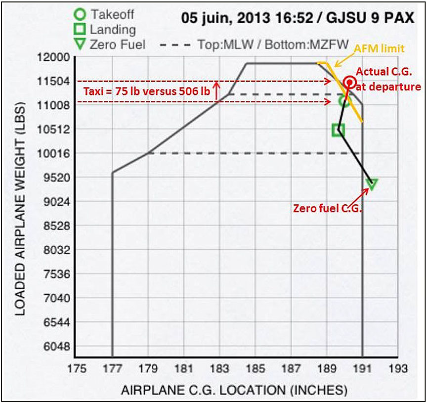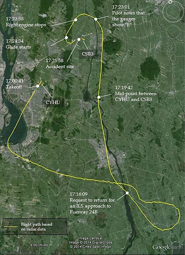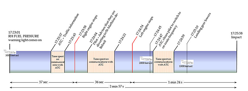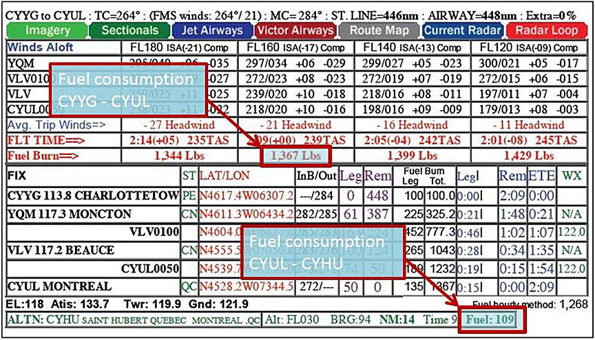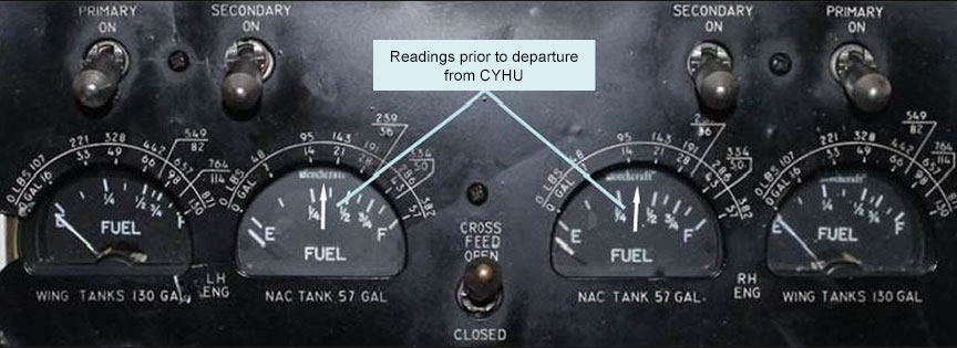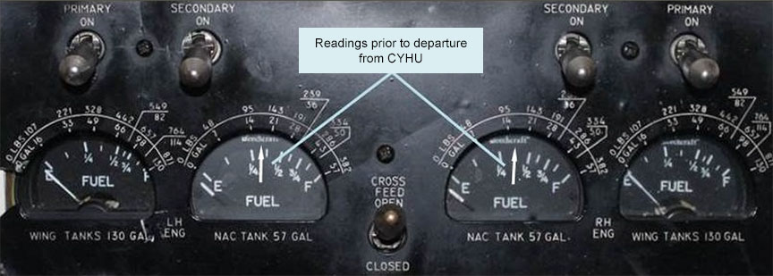 | Key point in flight | Time | Fuel on board (minutes:seconds) | Flight time to CYHU (minutes:seconds) |