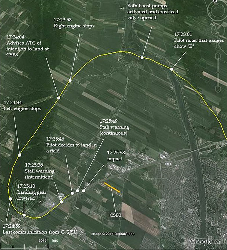 To determine the point at which C-GJSU could no longer reach its original destination airport, investigators calculated the quantity of fuel on board at key points or events in the flight and the flight times required to reach CYHU from each of those points at an average ground speed of 180 knots and with no allowance for a circuit prior to landing (Table 1).
