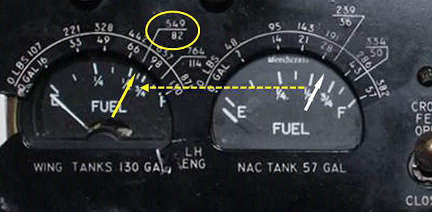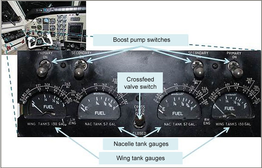 The fuel system is designed to feed the 2 engines independently of each other. Each engine is supplied by 4 wing tanks with a total capacity of 130 U.S. gallons of usable fuel. This fuel flows into an engine nacelle tank with a usable capacity of 57 U.S. gallons, for a total of 374 U.S. gallons (i.e., 2618 pounds for Jet A-1 fuel at 15°C).Footnote 15