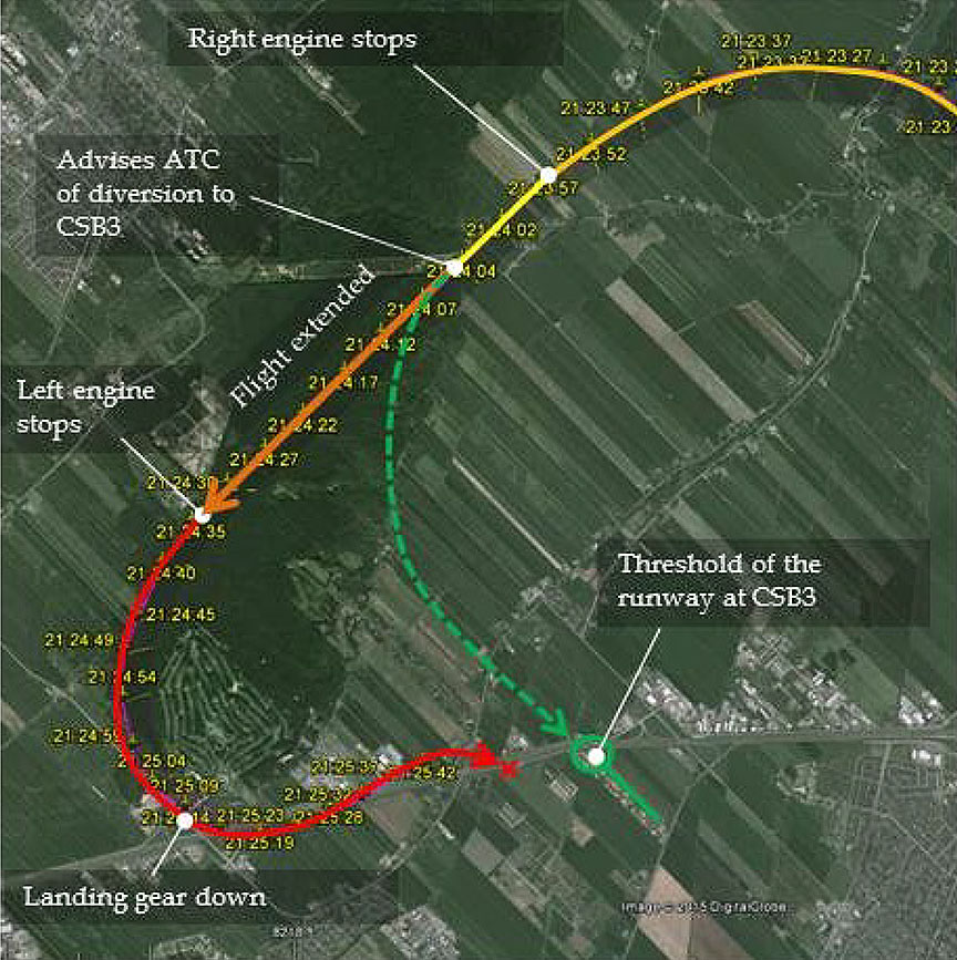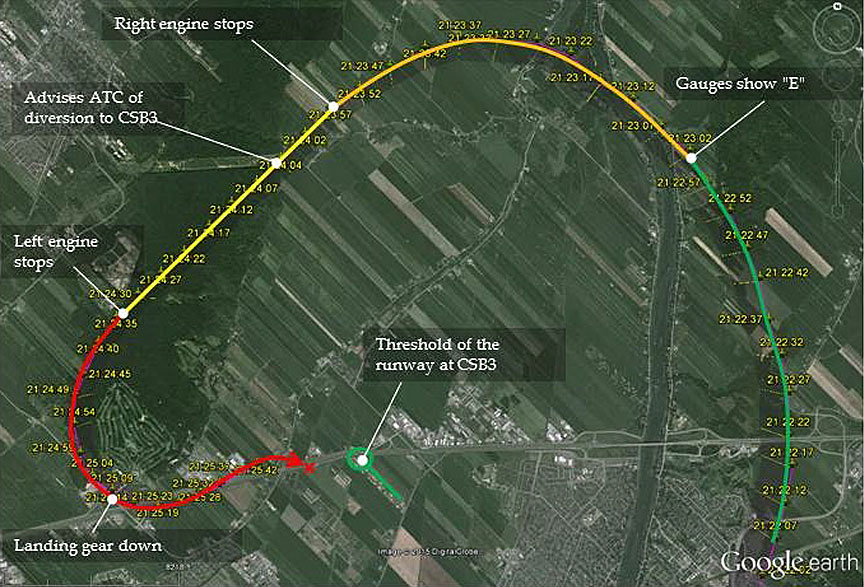 | Left engine stops, glide begins | 1724:34 | 0 | 02:33 |