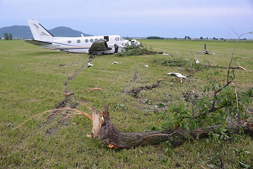 Four seconds later, C-GJSU experienced an aerodynamic stall. The right wing touched the ground at an angle of approximately 45°, then the aircraft hit a fence and a tree before severing 2 electrical wires and violently striking the grass-covered ground. The aircraft kept moving for another 120 feet before coming to a stop on its belly, approximately 0.5 nm southwest of CSB3.