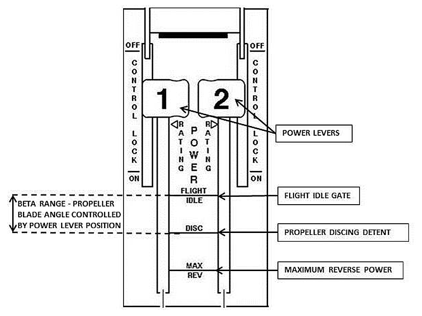 Moving the power levers aft of the FLIGHT IDLE gate will place them in the DISC detent. The DISC detent position has a mechanical slot. When the power levers are placed in the DISC detent, the propeller blade angle is such that it creates significant aerodynamic braking. When the power levers are moved further aft of the DISC detent, reverse power is selected; full movement aft (to MAX REV) applies maximum reverse power.
