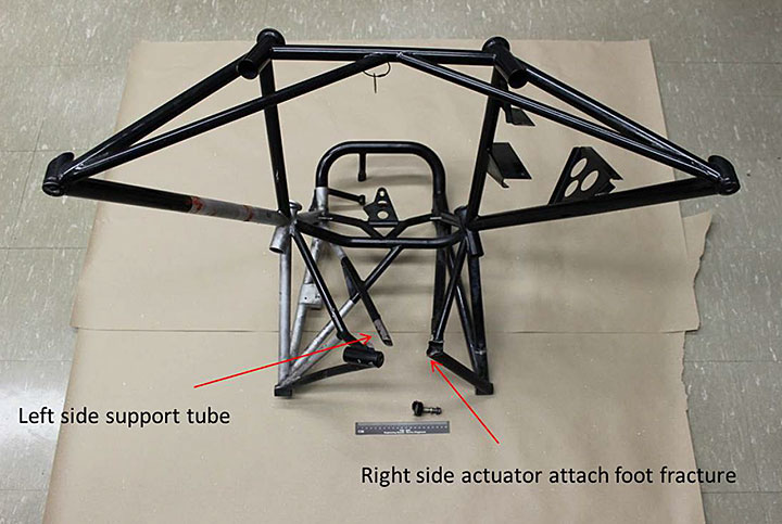 C-GSSA was equiped with the original engine mount installed at the time of manufacture. The investigation revealed that the right side actuator attach foot fractured mainly in overstress from a pre-existing fatigue crack located at the toe of the weld which attaches the right side actuator foot to the support tubes (Photo 2).