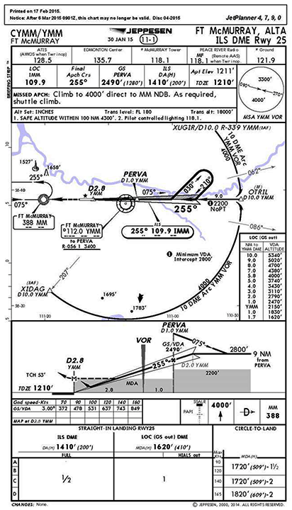 Navigational aids serving CYMM include the Fort McMurray non-directional beacon (MM NDB), the Fort McMurray very high frequency omnidirectional range (YMM VOR) with associated DME, and the IMMFootnote 10 ILS with associated DME. Runway 25 is served by ILS/DME, and area navigation and global navigation satellite system approaches.